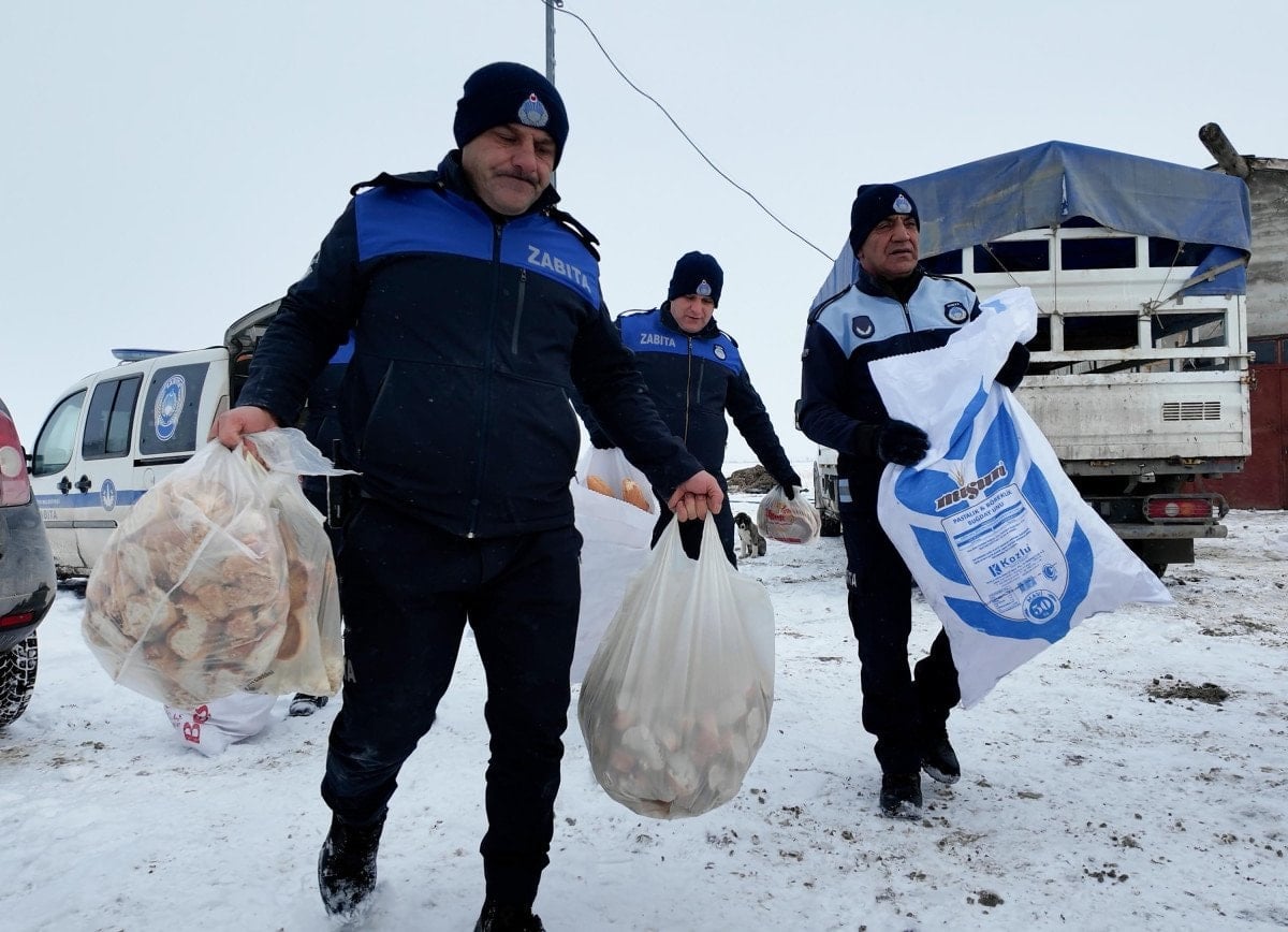 Yaban hayvanlarının insanlara tehdit oluşturmaması için araziye yiyecek bırakmak amacıyla Aziziye ilçesinde 20 ciritçi kilolarca tavuk eti, ekmek ve yem topladı.