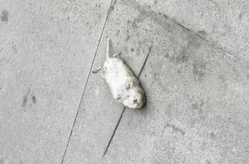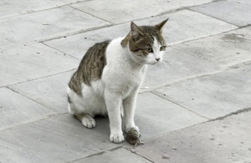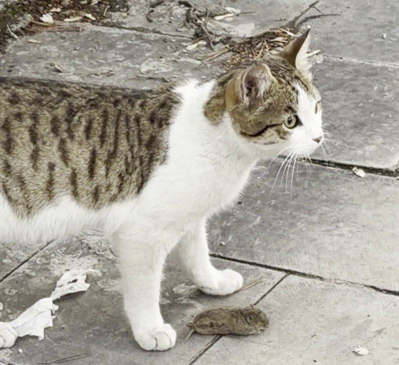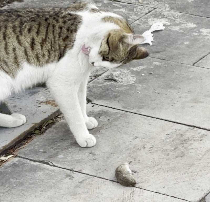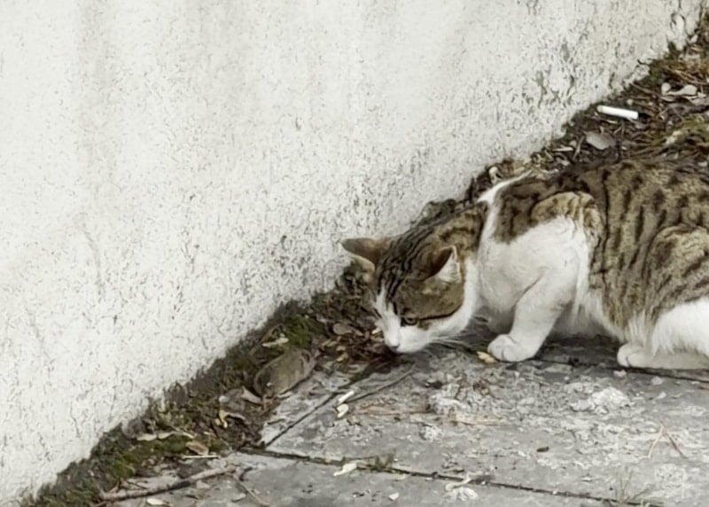 Kedinin tehdidi karşısında hareketsiz kalan fare, bir süre boyunca ölü taklidi yaptı. Bu davranışın ardından kedinin zaman zaman ilgisini kaybettiği ve fareyi avlamaktan vazgeçtiği görüldü.