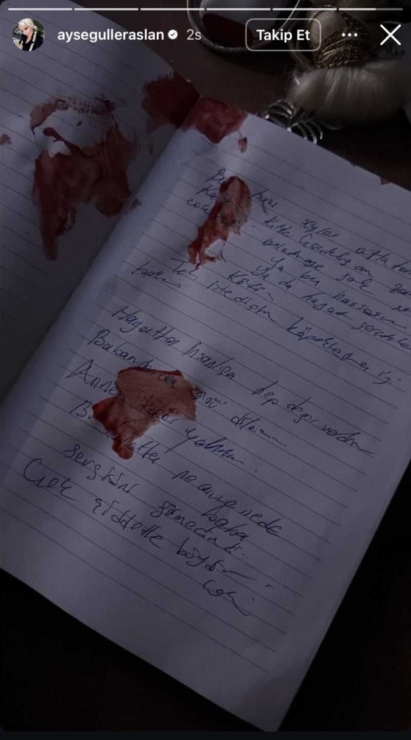 Ölümünden önce sanal medyada paylaştığı intihar mektubunda, Eraslan’ın hayatına son vermeden önce sol bileğini kesmesi nedeniyle kağıtta kan olduğu tespit edildi.