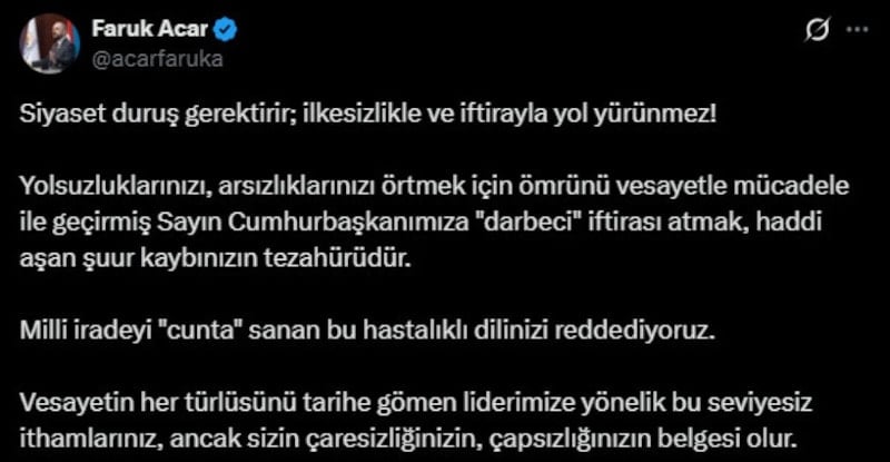 Acar, sosyal medya hesabından yaptığı paylaşımda, “Siyaset duruş gerektirir; ilkesizlikle ve iftirayla yol yürünmez! ​ Yolsuzluklarınızı, arsızlıklarınızı örtmek için ömrünü vesayetle mücadele ile geçirmiş Sayın Cumhurbaşkanımıza ‘darbeci’ iftirası atmak, haddi aşan şuur kaybınızın tezahürüdür. ​ Milli iradeyi ‘cunta’ sanan bu hastalıklı dilinizi reddediyoruz. Vesayetin her türlüsünü tarihe gömen liderimize yönelik bu seviyesiz ithamlarınız, ancak sizin çaresizliğinizin, çapsızlığınızın belgesi olur” ifadelerini kullandı.