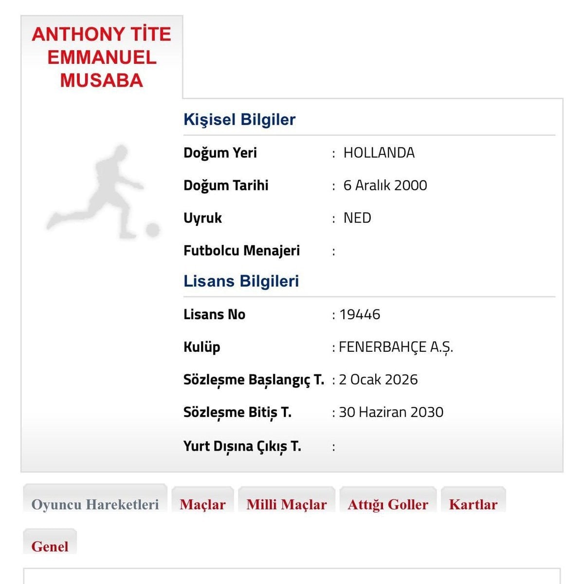 Sarı-lacivertli takımdan Türkiye Futbol Federasyonu’na yapılan bildirimde, Anthony Musaba ile 4.5 yıllık sözleşme imzalandığı belirtildi.
