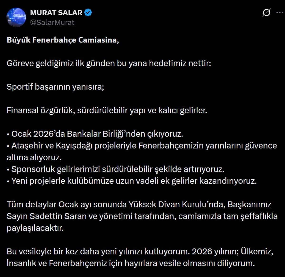 Salar, “Göreve geldiğimiz ilk günden bu yana hedefimiz nettir: Sportif başarının yanı sıra; finansal özgürlük, sürdürülebilir yapı ve kalıcı gelirler. Ocak ayında Bankalar Birliği’nden çıkıyoruz. Ataşehir ve Kayışdağı projeleriyle Fenerbahçemizin yarınlarını güvence altına alıyoruz. Sponsorluk gelirlerimizi sürdürülebilir şekilde artırıyoruz. Yeni projelerle kulübümüze uzun vadeli ek gelirler kazandırıyoruz. Tüm detaylar ocak ayı sonunda Yüksek Divan Kurulu’nda, Başkanımız Sadettin Saran ve yönetimi tarafından, camiamızla tam şeffaflıkla paylaşılacaktır. Bu vesileyle bir kez daha yeni yılınızı kutluyorum. 2026 yılının ülkemiz, İnsanlık ve Fenerbahçemiz için hayırlara vesile olmasını diliyorum” ifadelerini kullandı.