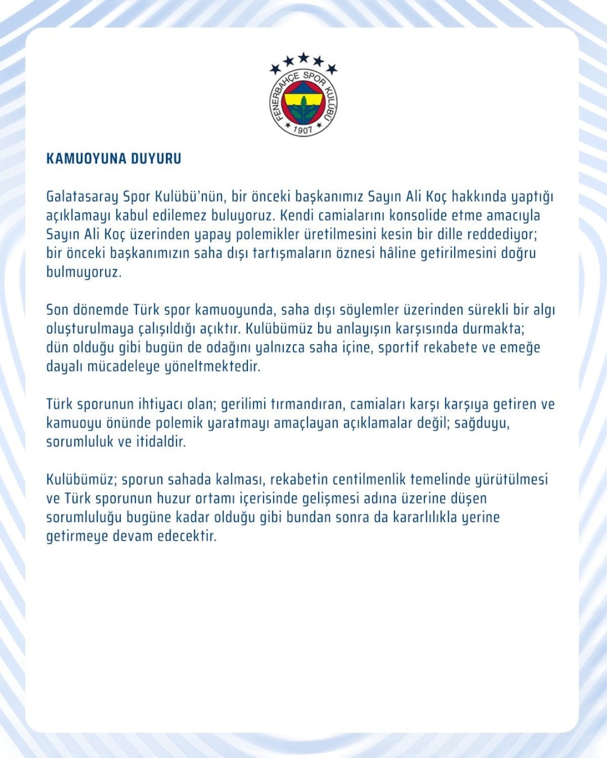 Galatasaray Spor Kulübü’nün, bir önceki başkanımız Sayın Ali Koç hakkında yaptığı açıklamayı kabul edilemez buluyoruz. Kendi camialarını konsolide etme amacıyla Sayın Ali Koç üzerinden yapay polemikler üretilmesini kesin bir dille reddediyor; bir önceki başkanımızın saha dışı tartışmaların öznesi haline getirilmesini doğru bulmuyoruz. Son dönemde Türk spor kamuoyunda, saha dışı söylemler üzerinden sürekli bir algı oluşturulmaya çalışıldığı açıktır. Kulübümüz bu anlayışın karşısında durmakta; dün olduğu gibi bugün de odağını yalnızca saha içine, sportif rekabete ve emeğe dayalı mücadeleye yöneltmektedir. Türk sporunun ihtiyacı olan; gerilimi tırmandıran, camiaları karşı karşıya getiren ve kamuoyu önünde polemik yaratmayı amaçlayan açıklamalar değil; sağduyu, sorumluluk ve itidaldir. Kulübümüz; sporun sahada kalması, rekabetin centilmenlik temelinde yürütülmesi ve Türk sporunun huzur ortamı içerisinde gelişmesi adına üzerine düşen sorumluluğu bugüne kadar olduğu gibi bundan sonra da kararlılıkla yerine getirmeye devam edecektir
