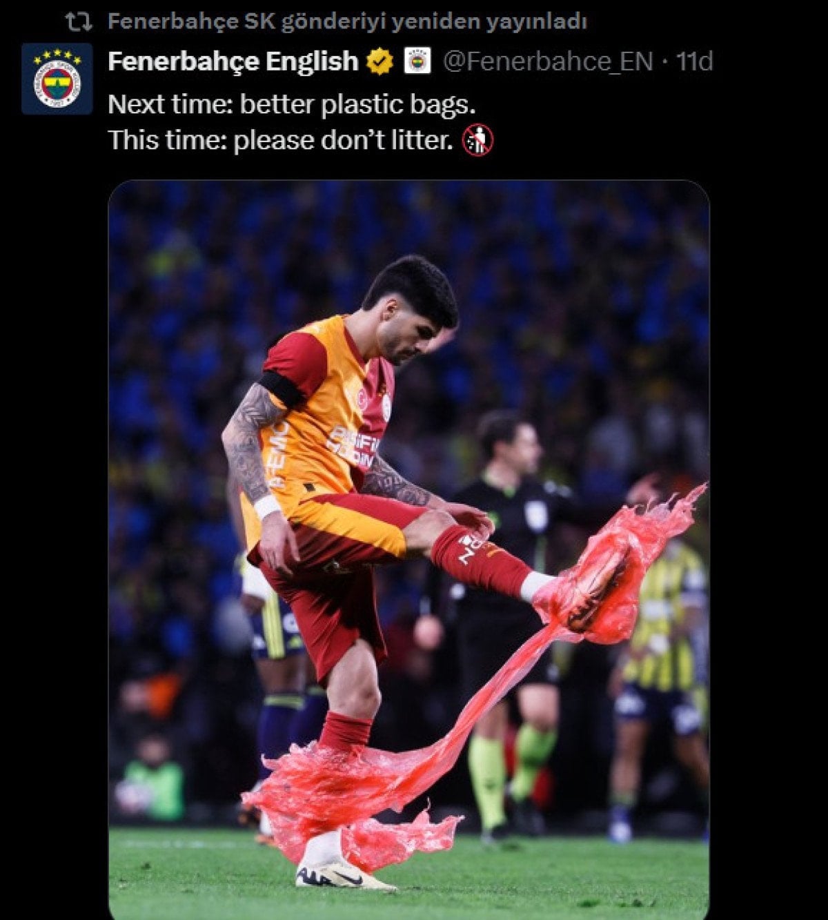 Fenerbahçe’nin İngilizce hesabı ise maçın ardından “Bir dahaki sefere: daha iyi plastik poşetler. Bu sefer: lütfen çöp atmayın” paylaşımını yaptı.