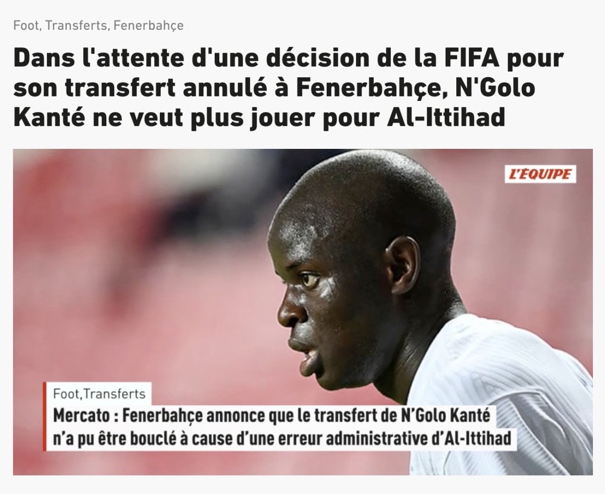 Suudi Arabistan ekibi Al-Ittihad’ın sisteme belgeleri hatalı yüklemesi sebebiyle transferi ilk etapta yetişmeyen Kante, Fenerbahçe’de oynamak için Suudi ekibine rest çekti.