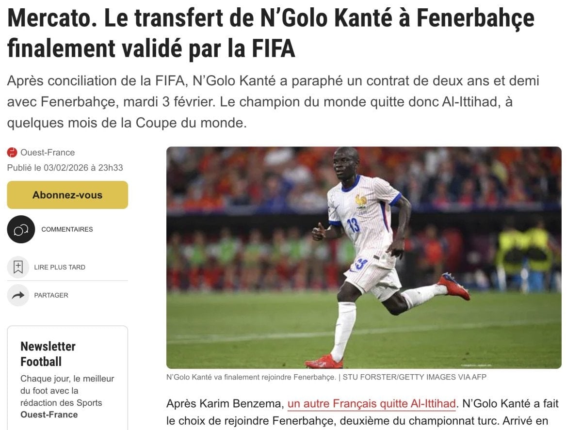 “N’Golo Kanté’nin Fenerbahçe’ye transferi FIFA tarafından nihayet onaylandı. Premier Lig’de sekiz sezon geçirdikten sonra Temmuz 2023’te Suudi Arabistan’a gelen 2018 Dünya Kupası şampiyonu, şüphesiz ligin en iyi oyuncularından biriydi. Mattéo Guendouzi ve Sidiki Chérif’in de forma giydiği kulüple Haziran 2028’e kadar, yani iki buçuk yıl geçerli bir sözleşme imzaladı.”