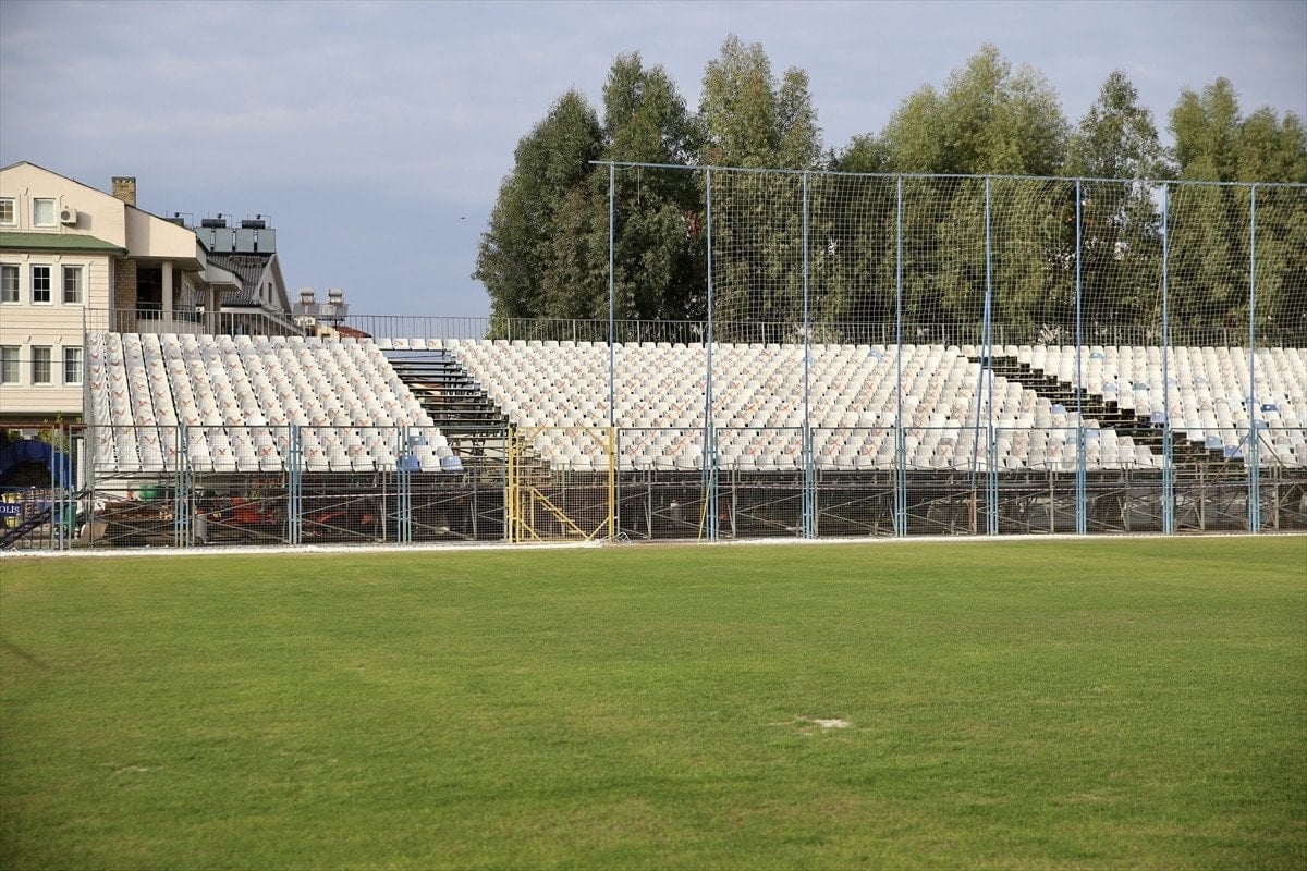 İlçe stadındaki deprem analiz raporunun olumsuz gelmesi nedeniyle yıkılan 3 bin kişilik tribünün yerine aynı kapasitede portatif tribün kuruldu.