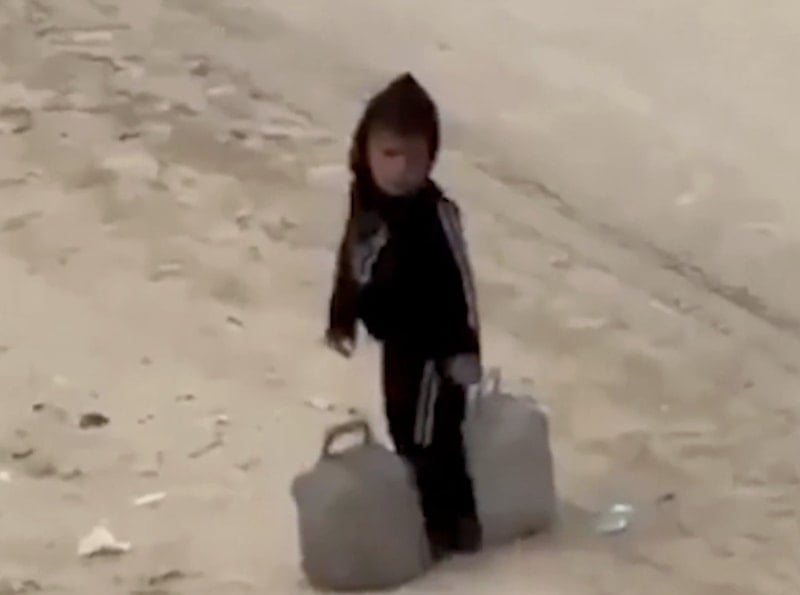 Ellerinde taşıdığı yüklerle zorlukla ilerleyen çocuğun yalnızlığı, bölgede devam eden çatışmaların siviller, özellikle de çocuklar üzerindeki yıkıcı etkisini dünyaya bir kez daha gösterdi.