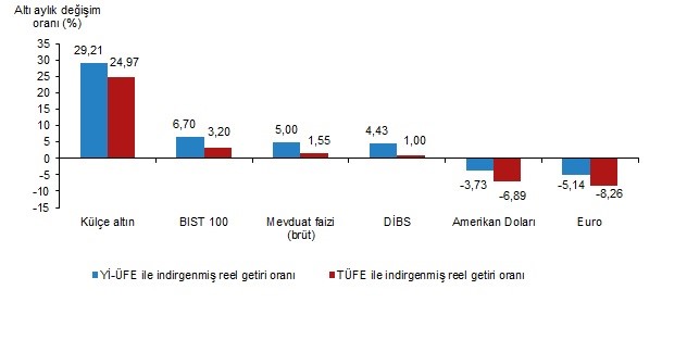 Altı aylık değerlendirmeye göre külçe altın; Yİ-ÜFE ile indirgendiğinde %29,21, TÜFE ile indirgendiğinde ise %24,97 oranlarında yatırımcısına en yüksek reel getiri sağlayan yatırım aracı olurken; aynı dönemde Euro Yİ-ÜFE ile indirgendiğinde %5,14, TÜFE ile indirgendiğinde ise %8,26 oranlarında yatırımcısına en çok kaybettiren yatırım aracı oldu