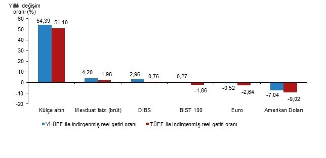 Yİ-ÜFE ile indirgendiğinde; yatırım araçlarından, Amerikan Doları %1,14, Euro %3,37, Devlet İç Borçlanma Senetleri (DİBS) %3,87, külçe altın %5,01 ve BIST 100 endeksi %8,77 oranlarında yatırımcısına kaybettirdi. TÜFE ile indirgendiğinde ise Amerikan Doları %0,79, Euro %3,03, DİBS %3,53, külçe altın %4,68 ve BIST 100 endeksi %8,45 oranlarında yatırımcısına kaybettirdi.