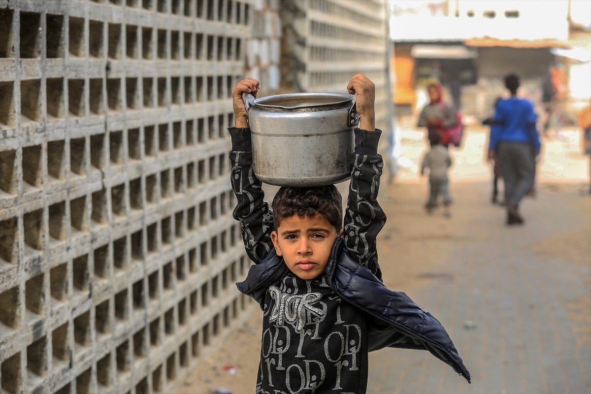 Yemekten almak isteyen ve aralarında çocukların da bulunduğu çok sayıda Filistinli, bir kap yemeğe ulaşabilmek için soğuk havaya rağmen yoğunluk oluşturdu.