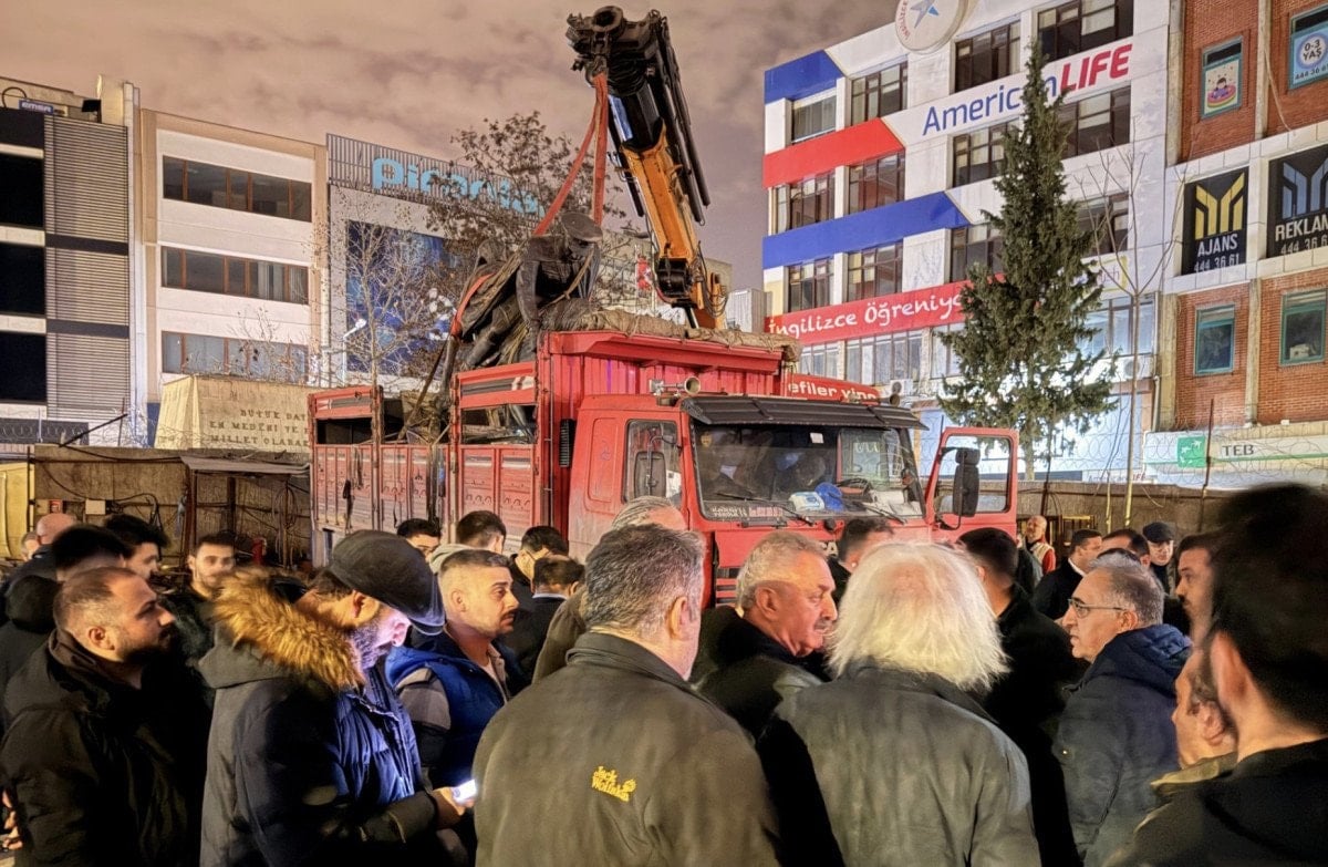 Vinçlerle anıtın kaldırılıp kamyonlara yüklendiğini gören CHP’li yönetici ve partililer hemen meydana akın etti.