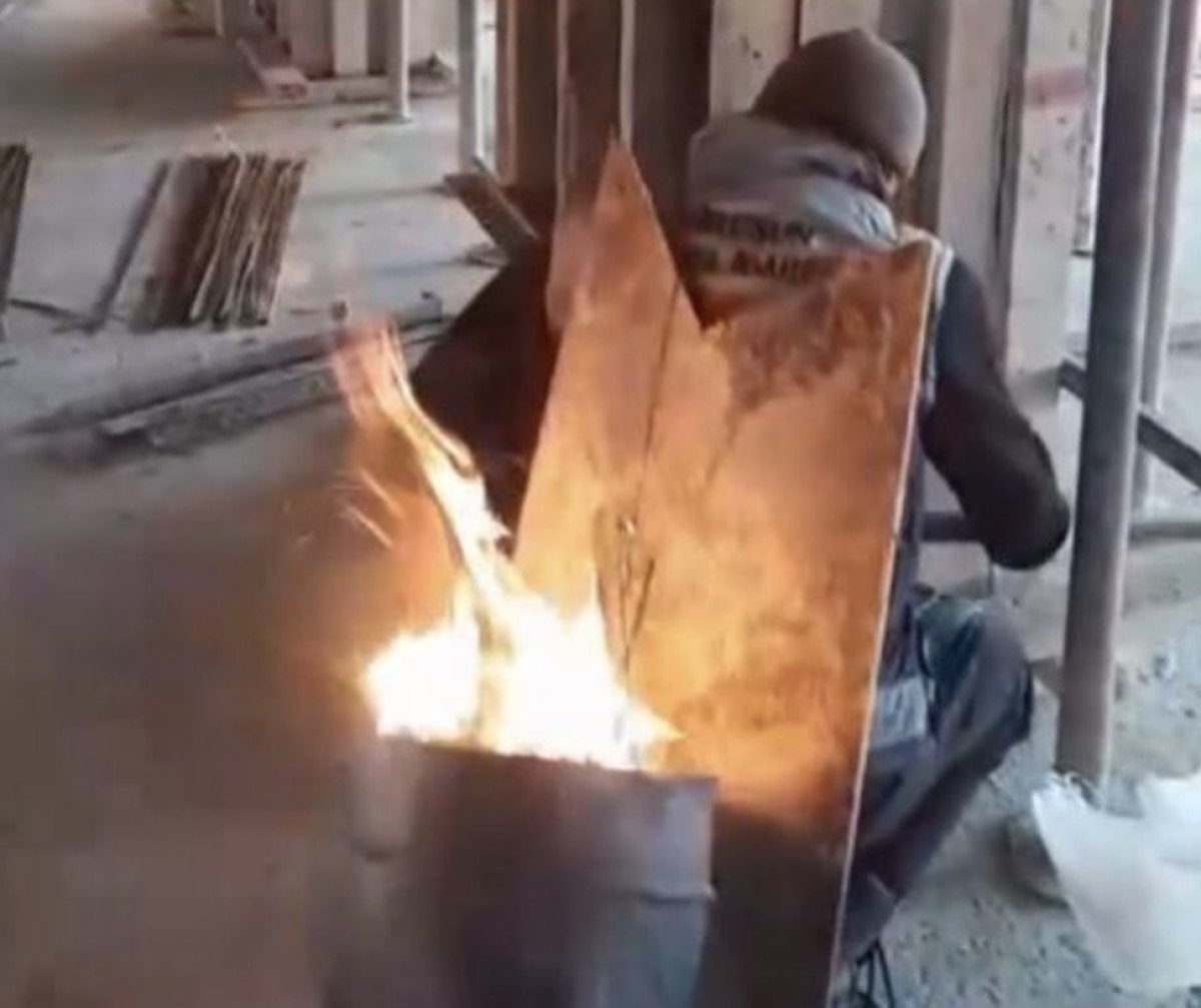 Bulut’un, sırtında yanan ateşle inşaatta kalıp çakıp, mesaisine devam ettiği anlar, cep telefonu kamerasıyla kaydedildi.