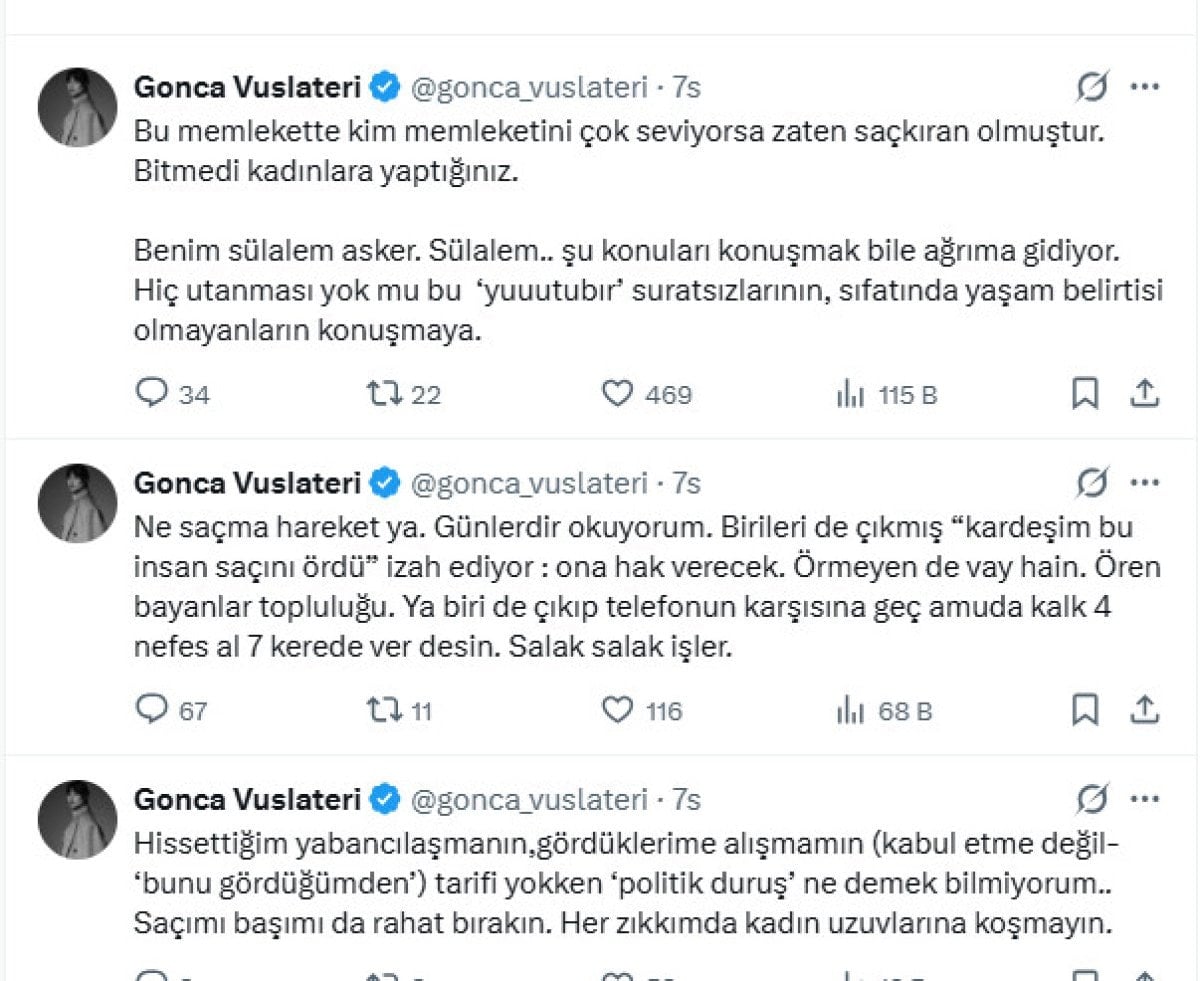 Kadınlar üzerinden yürütülen kampanyalara karşı olduğunu vurgulayan Vuslateri, “Bu memlekette kim memleketini çok seviyorsa zaten saçkıran olmuştur. Bitmedi kadınlara yaptığınız” ifadelerini kullandı.