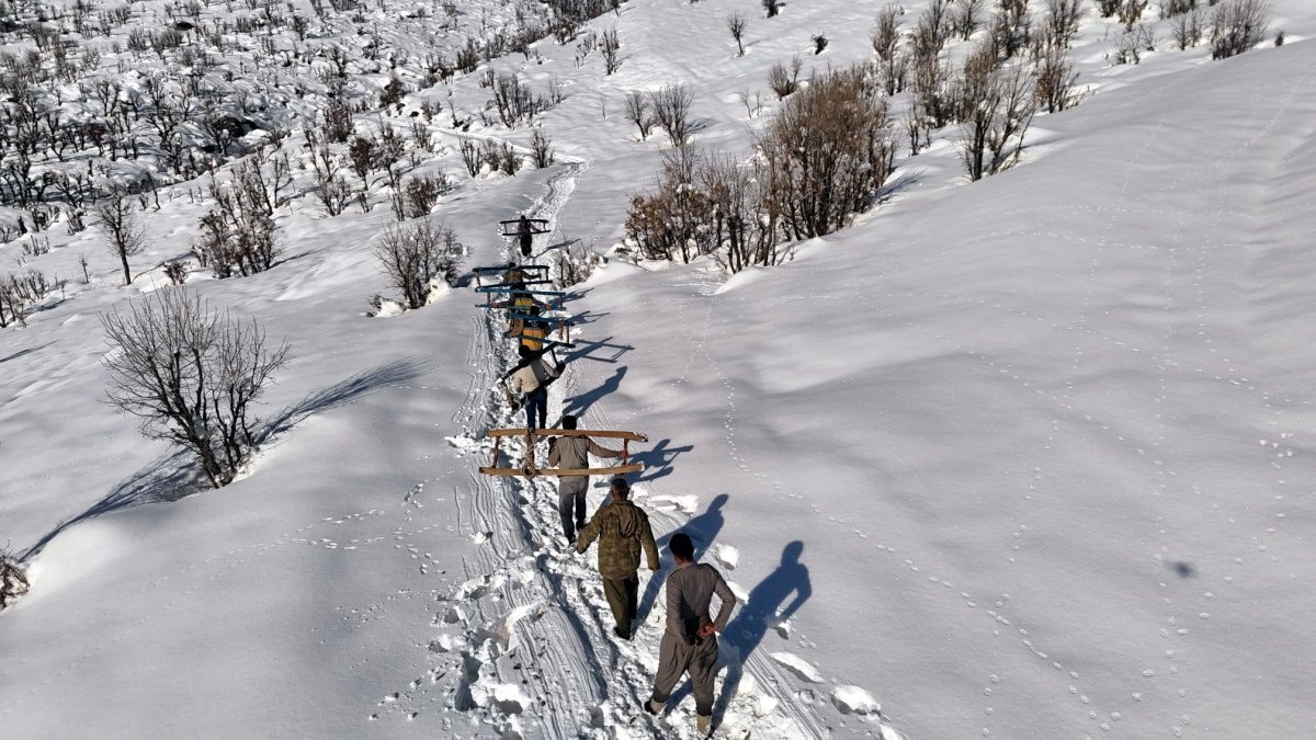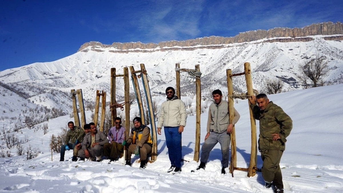 Kar yağışının ardından omuzlarına aldıkları kızaklarla dağlara çıkan besiciler, yaklaşık 1,5 saatlik yürüyüşün ardından otlara ulaşıyor.