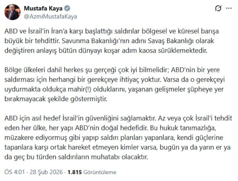 Saadet Partisi Genel Başkan Yardımcısı Mustafa Kaya’nın paylaşımı: