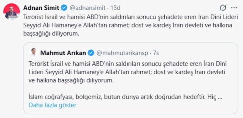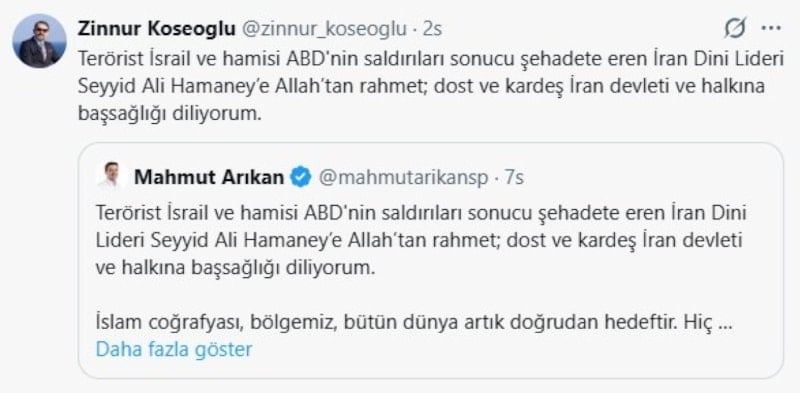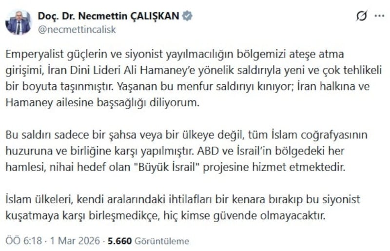Emperyalist güçlerin ve siyonist yayılmacılığın bölgemizi ateşe atma girişimi, İran Dini Lideri Ali Hamaney’e yönelik saldırıyla yeni ve çok tehlikeli bir boyuta taşınmıştır. Yaşanan bu menfur saldırıyı kınıyor; İran halkına ve Hamaney ailesine başsağlığı diliyorum.