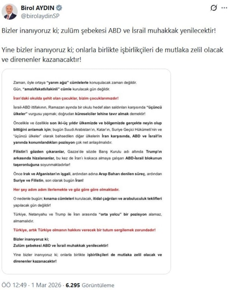 Saadet Partisi İstanbul Milletvekili Birol Aydın’ın paylaşımı: