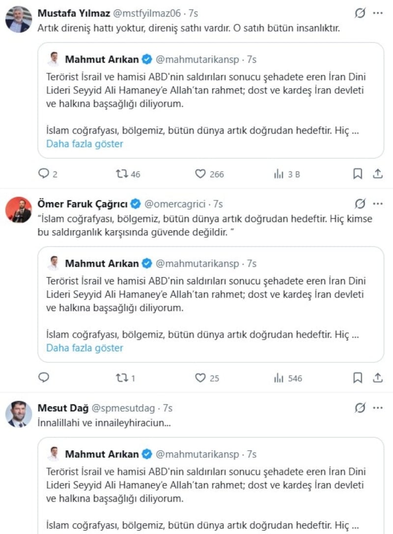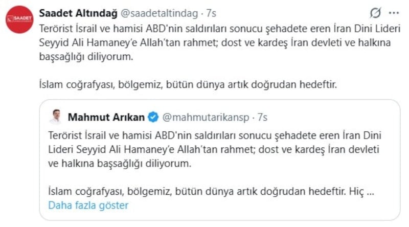 Saadet Partisi Genel Başkanı Mahmut Arıkan, Saadet Partisi Genel Başkan Yardımcısı Mustafa Kaya, Saadet Partisi GİK Üyesi, Hatay Milletvekili Necmettin Çalışkan, Saadet Partisi İstanbul Milletvekili Birol Aydın ve birçok partili ve milletvekili, saldırılarda öldürülen İran dini lideri Ali Hamaney için sosyal medya hesaplarından paylaşımlarda bulundu.