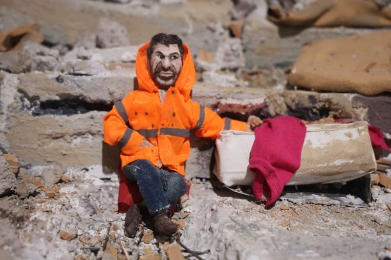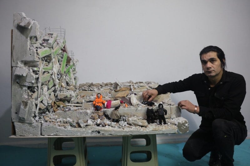 Depremde kız kardeşinin ölümünden etkilenen Kocaman, iki çocuk babası olmasının verdiği üzüntüyle Kahramanmaraş’ta deprem enkazında evladının elini bırakmayan Mesut Hançer’den etkilenerek olayı minyatürize etti.