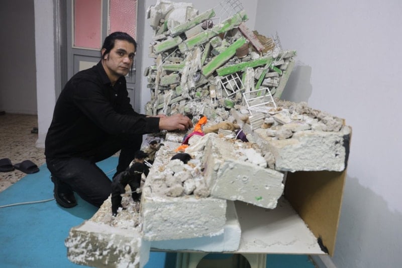 Asrın felaketinde yaşanmış olaylardan ve fotoğraflardan esinlenerek 3 ay içerisinde deprem minyatürü yapan Kocaman, çalışmasının tamamında atık malzemeleri kullandı.