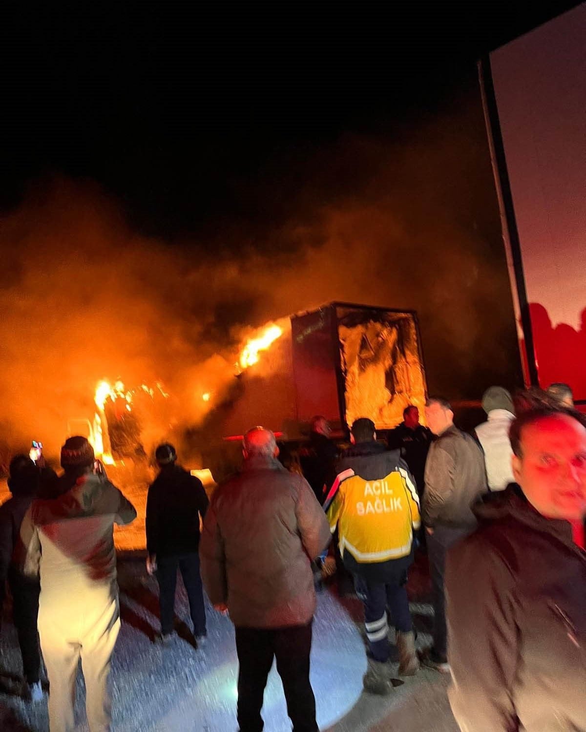 Alevler içinde kalan tırın yandığını fark eden vatandaşlar durumu 112 Acil Çağrı Merkezi’ne bildirdi.