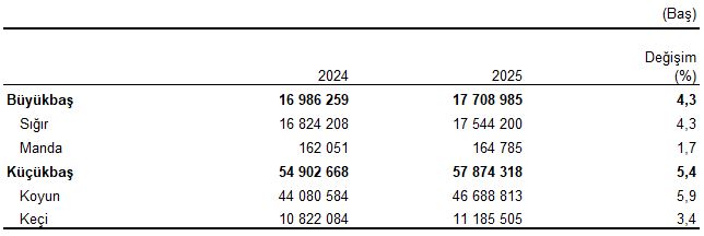Küçükbaş hayvan kategorisinde, koyun sayısı bir önceki yıla göre %5,9 oranında artarak 46 milyon 689 bin baş, keçi sayısı ise bir önceki yıla göre %3,4 oranında artarak 11 milyon 186 bin baş oldu.