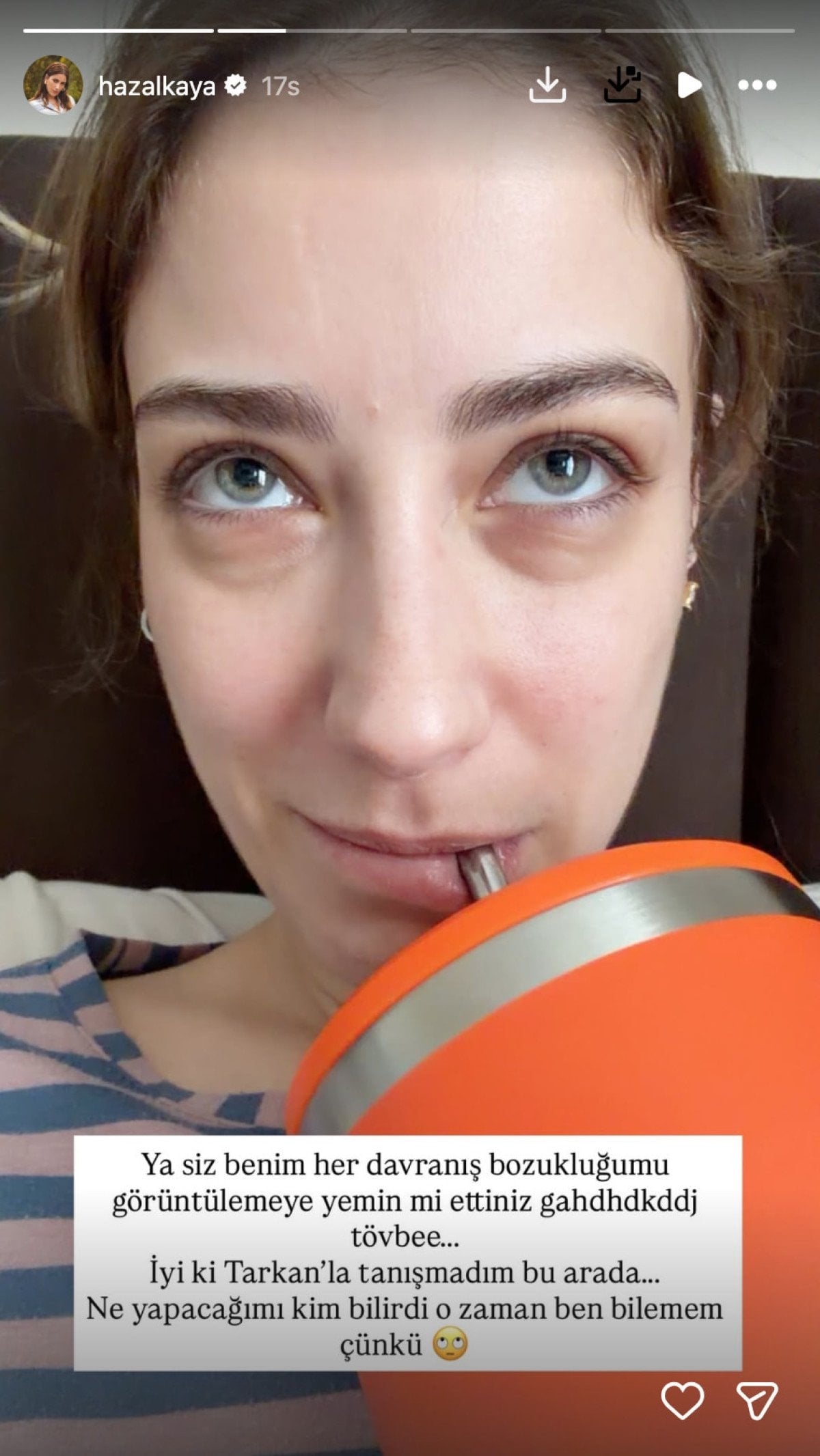 Oyuncu, “Ya siz benim her davranış bozukluğumu görüntülemeye yemin mi ettiniz? İyi ki Tarkan’la tanışmadım bu arada… Ne yapacağımı kim bilirdi, o zaman ben bilemem çünkü” dedi.