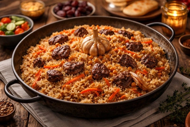 Orta Asya mutfağının en sevilen yemeklerinden biri olan bu pilav; et, pirinç ve sebzelerin uyumuyla hazırlanan zengin bir lezzet sunuyor.