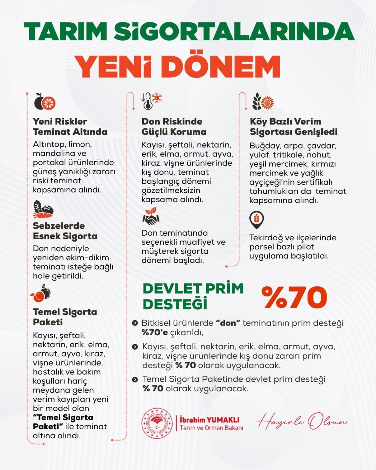 Don teminatı ve Temel Sigorta Paketi için devlet prim desteğini yüzde 70’e çıkardıklarını belirten Yumaklı, “Üreticimizin emeğini daha geniş kapsamla, daha güçlü desteklerle korumaya devam ediyoruz.” değerlendirmesinde bulundu.