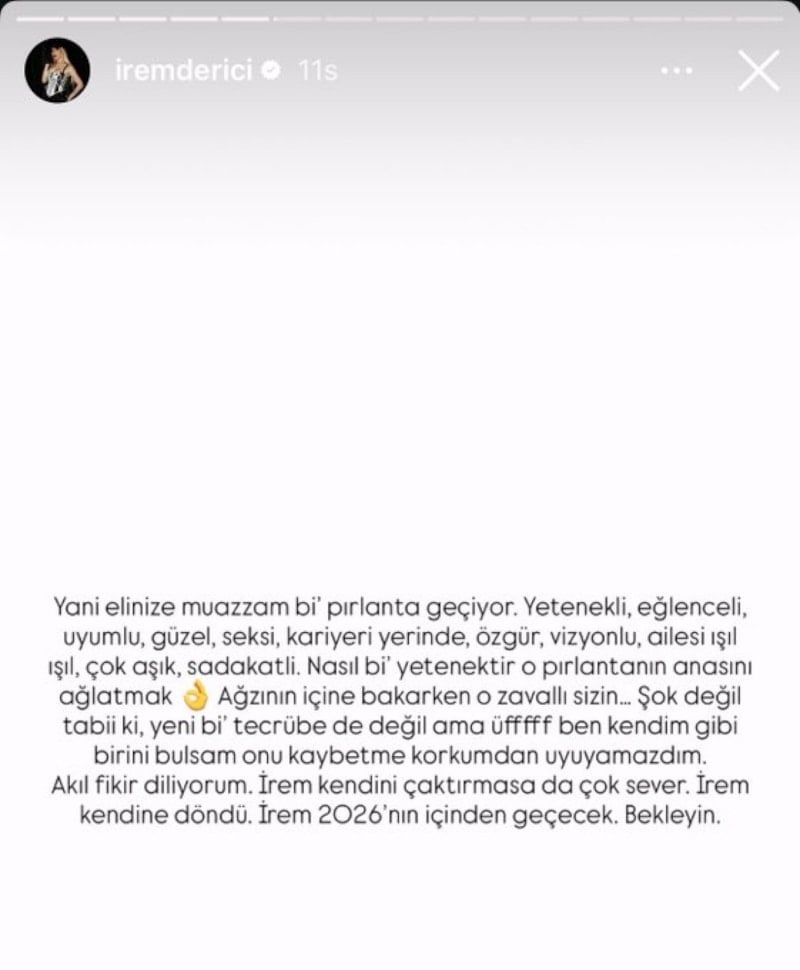 Derici paylaşımında, “Yani elinize muazzam bi’ pırlanta geçiyor. Yetenekli, eğlenceli, uyumlu, güzel, seksi, kariyeri yerinde, özgür, vizyonlu, ailesi ışıl ışıl, çok aşık, sadakatli. Nasıl bi’ yetenektir o pırlantanın anasını ağlatmak. Ağzının içine bakarken o zavallı sizin… Şok değil tabii ki, yeni bi’ tecrübe de değil ama üfffff ben kendim gibi birini bulsam onu kaybetme korkumdan uyuyamazdım. Akıl fikir diliyorum. İrem kendini çaktırmasa da çok sever. İrem kendine döndü. İrem 2026’nın içinden geçecek. Bekleyin.” ifadelerini kullandı.