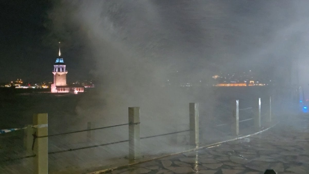 Lodosun etkisiyle sahil boyunca oluşan dalgalar dikkat çekerken Kız Kulesi’ni görmeye gelenler zor anlar yaşadı.