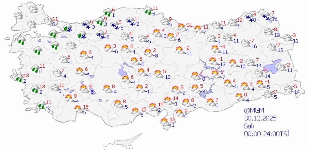 Bölgede 26 Aralık 2025 ile 2 Ocak 2026 tarihleri arasında en düşük hava sıcaklıklarının İstanbul’da 0, Edirne’de -3, Kırklareli’de -3, Tekirdağ’da -1, Kocaeli’de -1, Sakarya’da -2, Yalova’da 1 dereceye kadar düşeceği tahmin ediliyor.