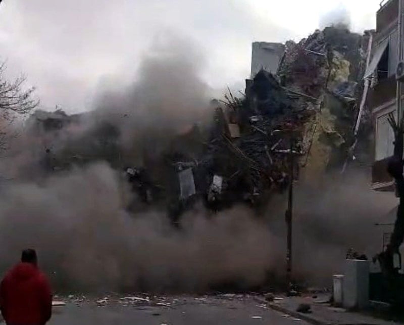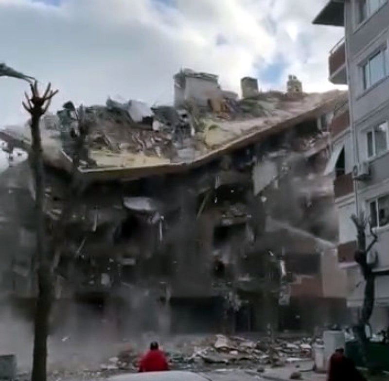 Yıkım çalışmaları sürerken, iş makinesiyle binanın çatı kısmına beton kesme makasıyla darbe vuruldu ve darbenin ardından da bina çöktü.