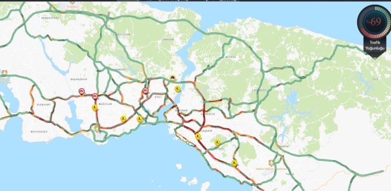 İBB Trafik Yoğunluk Haritası’na göre trafik yoğunluğu, saat 08.15 itibarıyla yüzde 69’a ulaştı.