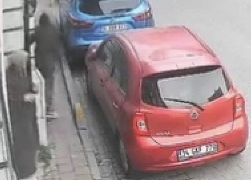 Güvenlik kamerası görüntülerinde, binanın önünde elinde telefonla duran kadına yavaş adımlarla yaklaşan şüpheli, kısa sürede çevreyi kontrol etti.