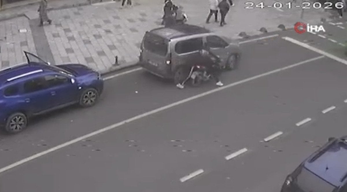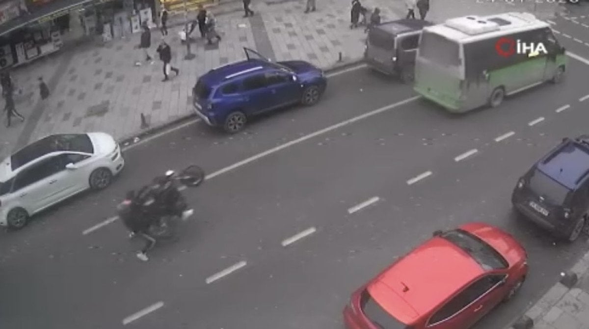 Görüntülerde motosikletlinin ön kaldırdığı, park halindeki araca çarptığı, yolcunun yere düştüğü ve ardından motosikletlinin kaçtığı anlar net şekilde görüldü.