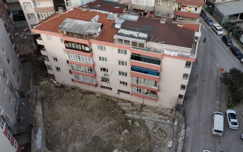 5 katlı bina, sabahın ilk ışıklarıyla birlikte havadan görüntülendi. Çekilen drone görüntülerinde, tahliye edilen binanın altındaki toprak kaymasını ve temel ile zemin arasındaki açıklık net bir şekilde kaydetti.