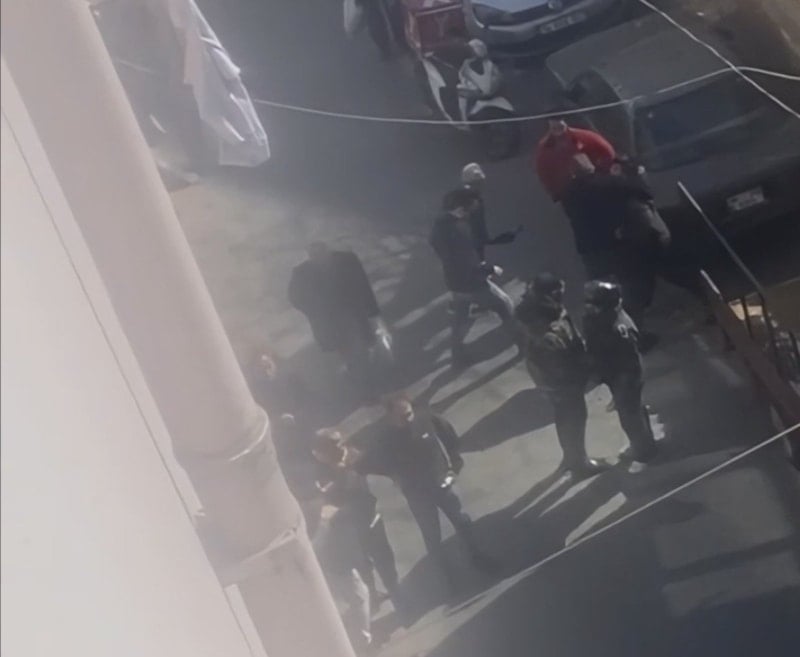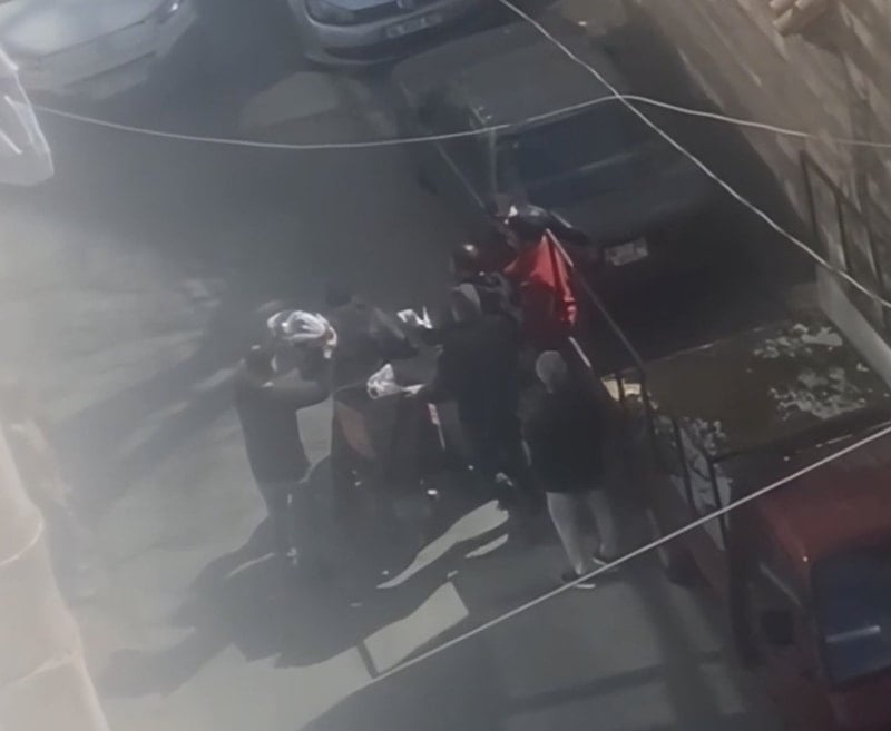 Araç sahibi ve yanındakiler, kaskını çıkardıkları moto kuryeyi sokak ortasında darbetti.