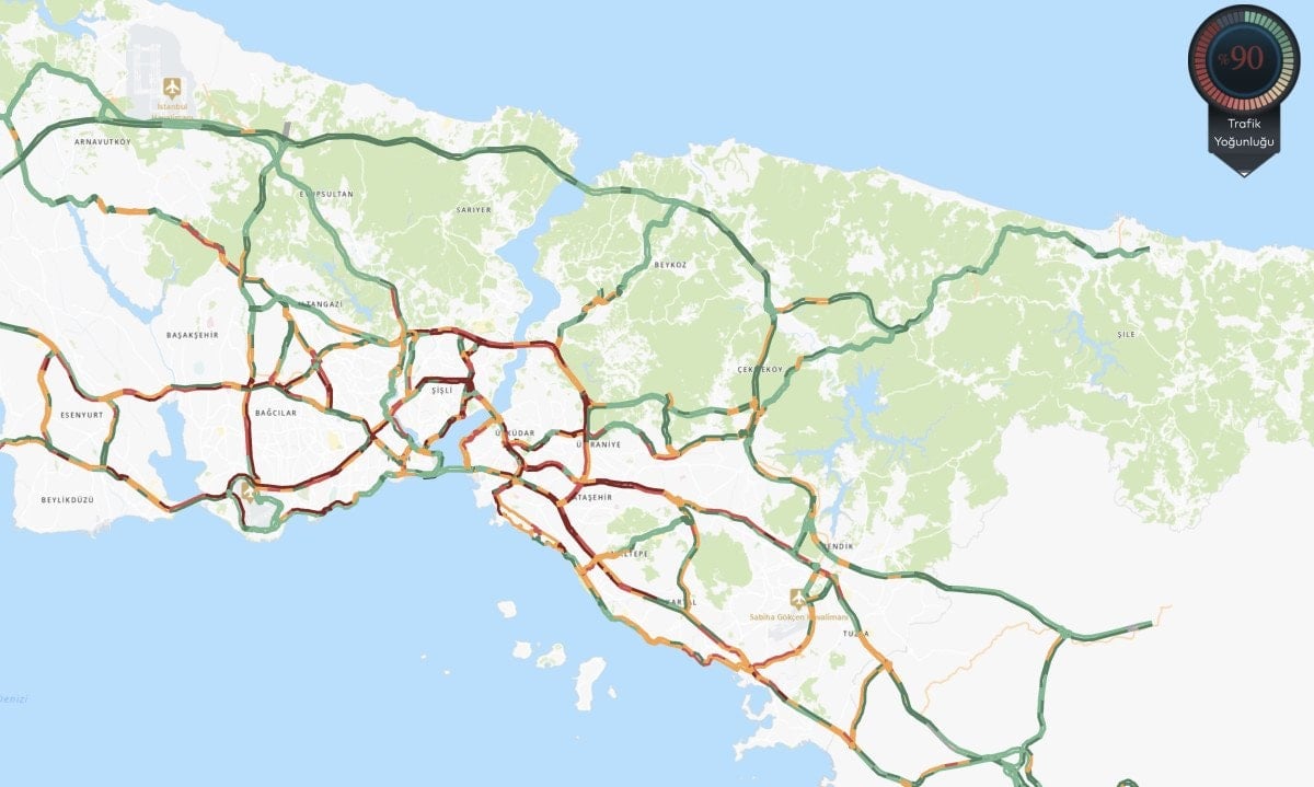 İstanbul Büyükşehir Belediyesinin CepTrafik uygulaması verilerine göre, kent genelindeki trafik yoğunluğu yüzde 90’a kadar çıktı.