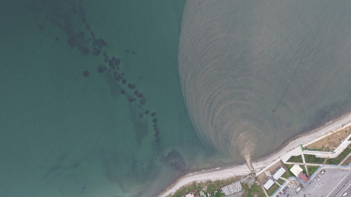 Havadan kaydedilen görüntülerde, atık suyun denize karıştığı yerde deniz yüzeyinin bulanık bir hal aldığı, temiz suyla kirli su arasındaki sınırın net biçimde görüldüğü dikkat çekiyor.