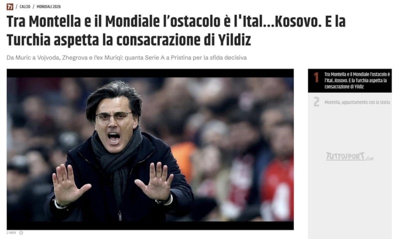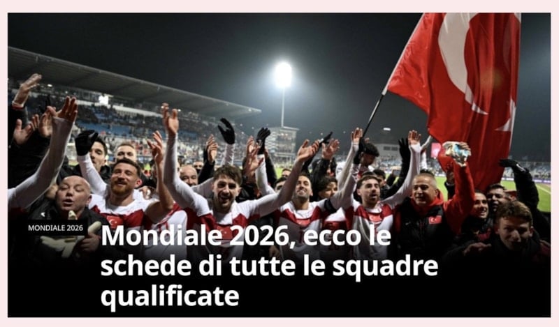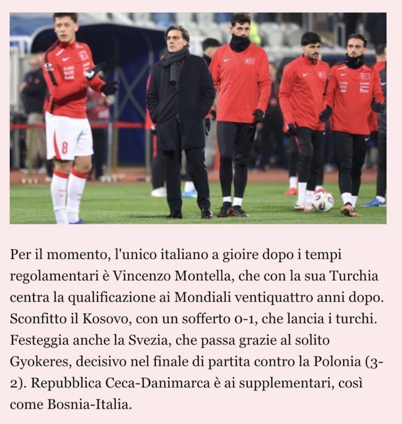 2026 FIFA Dünya Kupası Avrupa Elemeleri’nde play-off turu final maçlarında İtalya’nın Bosna Hersek’e penaltı atışlarında elenmesi, diğer taraftan ise Vincenzo Montella yönetimindeki A Milli Takım’ın ise Kosova’yı 1-0 yenerek Dünya Kupası bileti alması İtalyan basınında geniş yankı buldu.