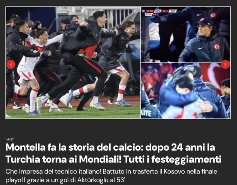 Corriere dello Sport gazetesi, İtalya’nın finallere gitme şansını bir kez daha kaybederken, bir İtalyan teknik adamın ise Türkiye’yi 24 yıl sonra Dünya Kupası’na götürmesini, “Montella’dan tam isabet” başlığıyla duyurdu.