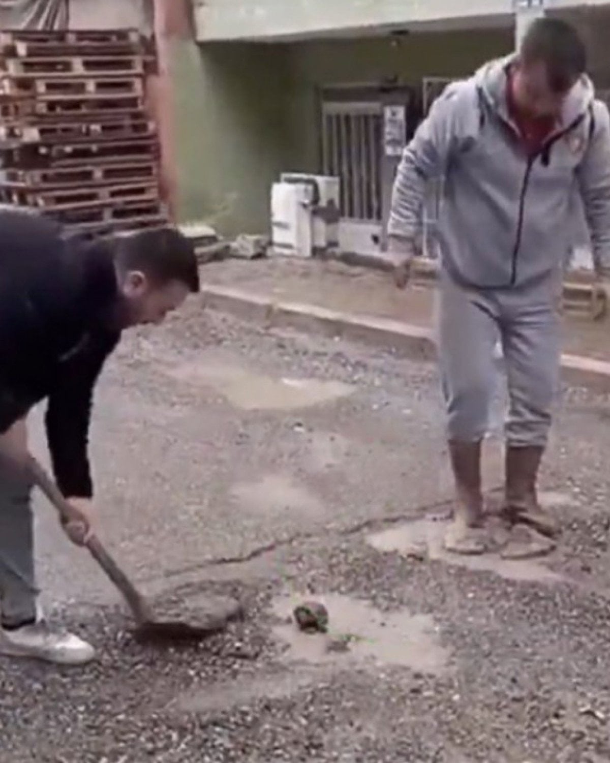 Yine Karabağlar’da olduğu gibi Buca’da da vatandaşlar, kendi imkanlarıyla yolları onarıyor.