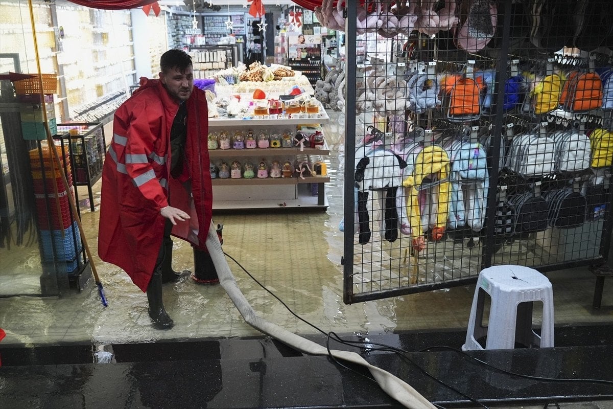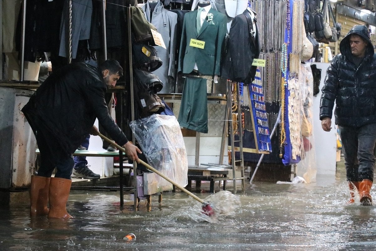 Esnaf, dükkanlarında biriken suyu fırça yardımıyla tahliye etmeye çalıştı.