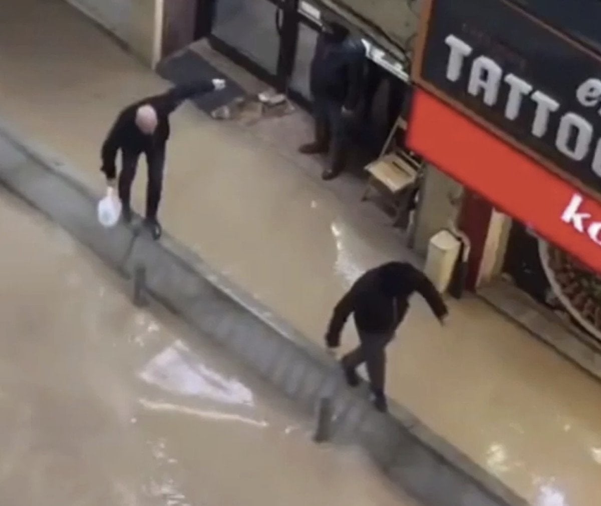 Vatandaşların, derin su birikintisinde kollarını açıp dengesini korumaya çalıştığı cep telefonu kameralara yansıdı.