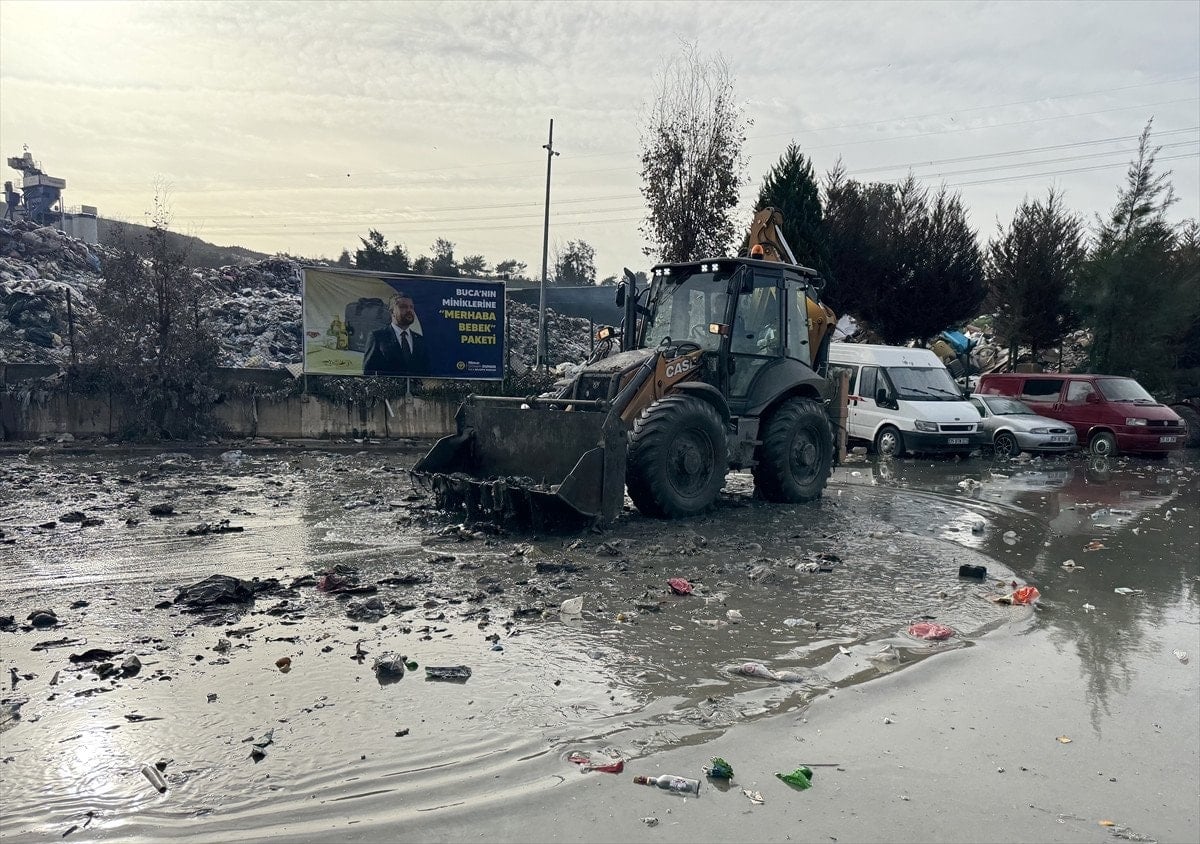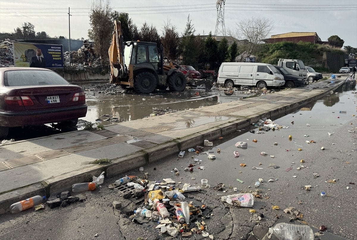 İzmir’de şantiyede bekletilen çöpler yağmur sularıyla sokağa dağıldı