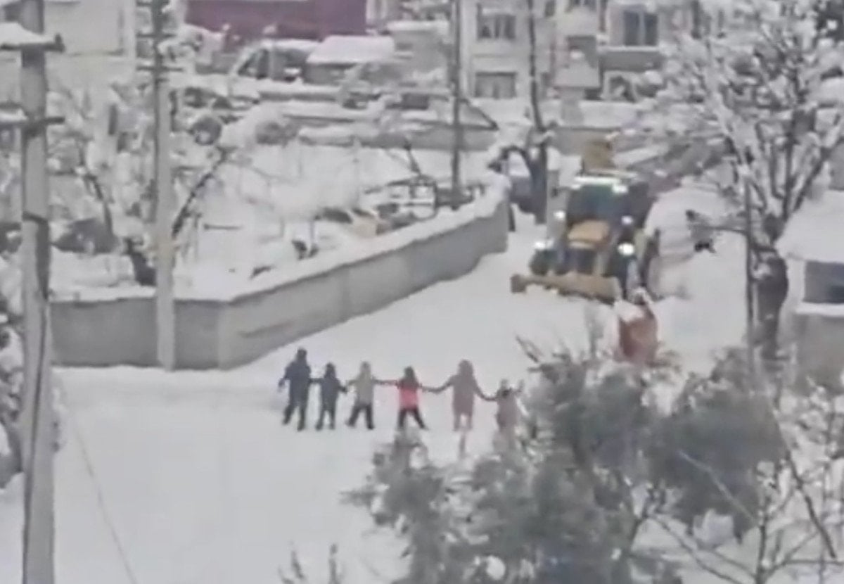 Kentte çocuklar, sokaktaki karların temizlenmesini engellemek için ele ele tutuşarak ekiplerin yolunu kesti.