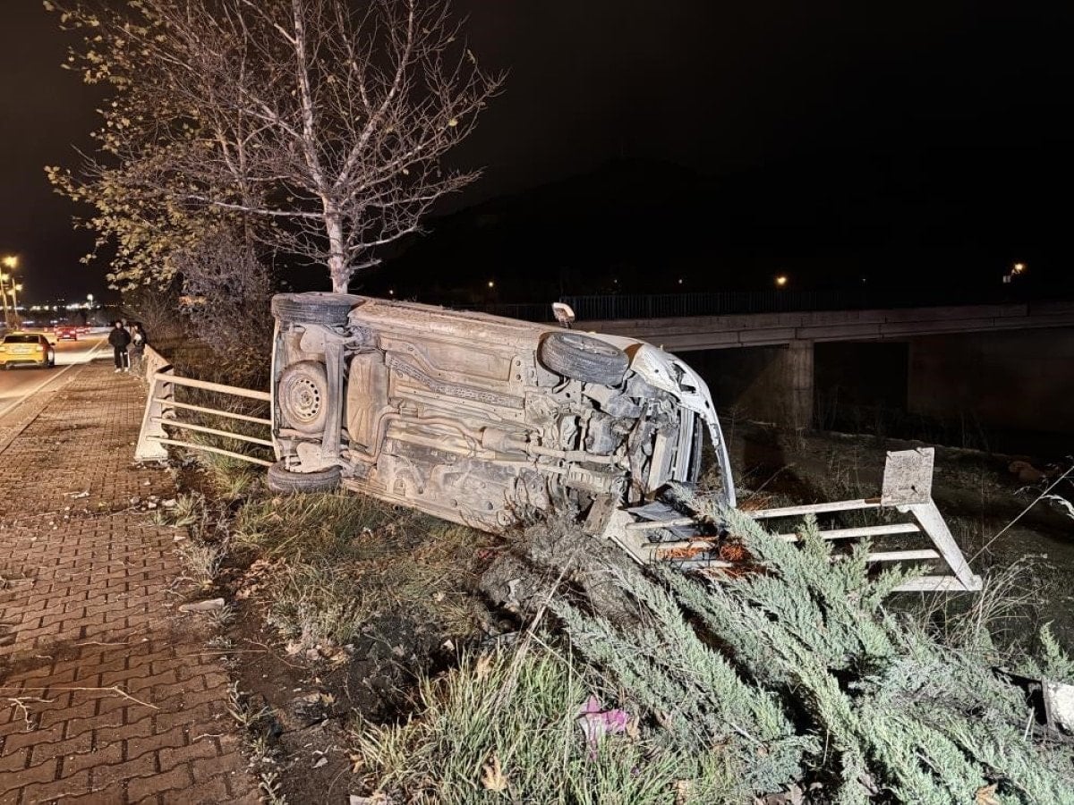 Çarpışmanın etkisiyle hafif ticari araç yol kenarındaki demir korkuluklara çarparak devrilirken, otomobil ise refüje çarparak durabildi.