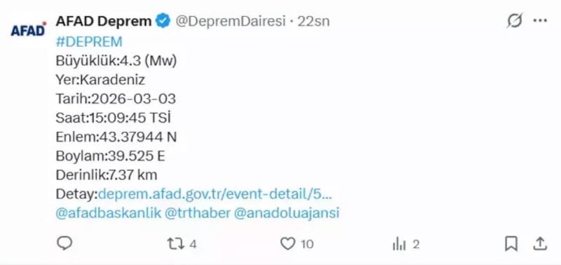 AFAD’dan yapılan açıklamada Karadeniz’de, Rusya’nın Soçi kenti yakınlarında 4.3 büyüklüğünde bir deprem meydana geldiği duyuruldu.